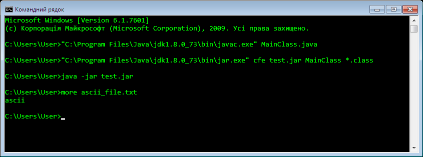 Після компілювання і виконання даного коду в терміналі можна побачити наступний результат (код міститься у файлі “MainClass.java”, за допомогою команди “more” виводимо вміст файлу в термінал):