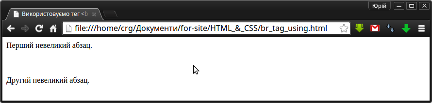 Для того щоб вставити в документ новий рядок або декілька пустих рядків, можна використовувати тег “<br>”, який не закривається. Розглянемо наступний приклад: